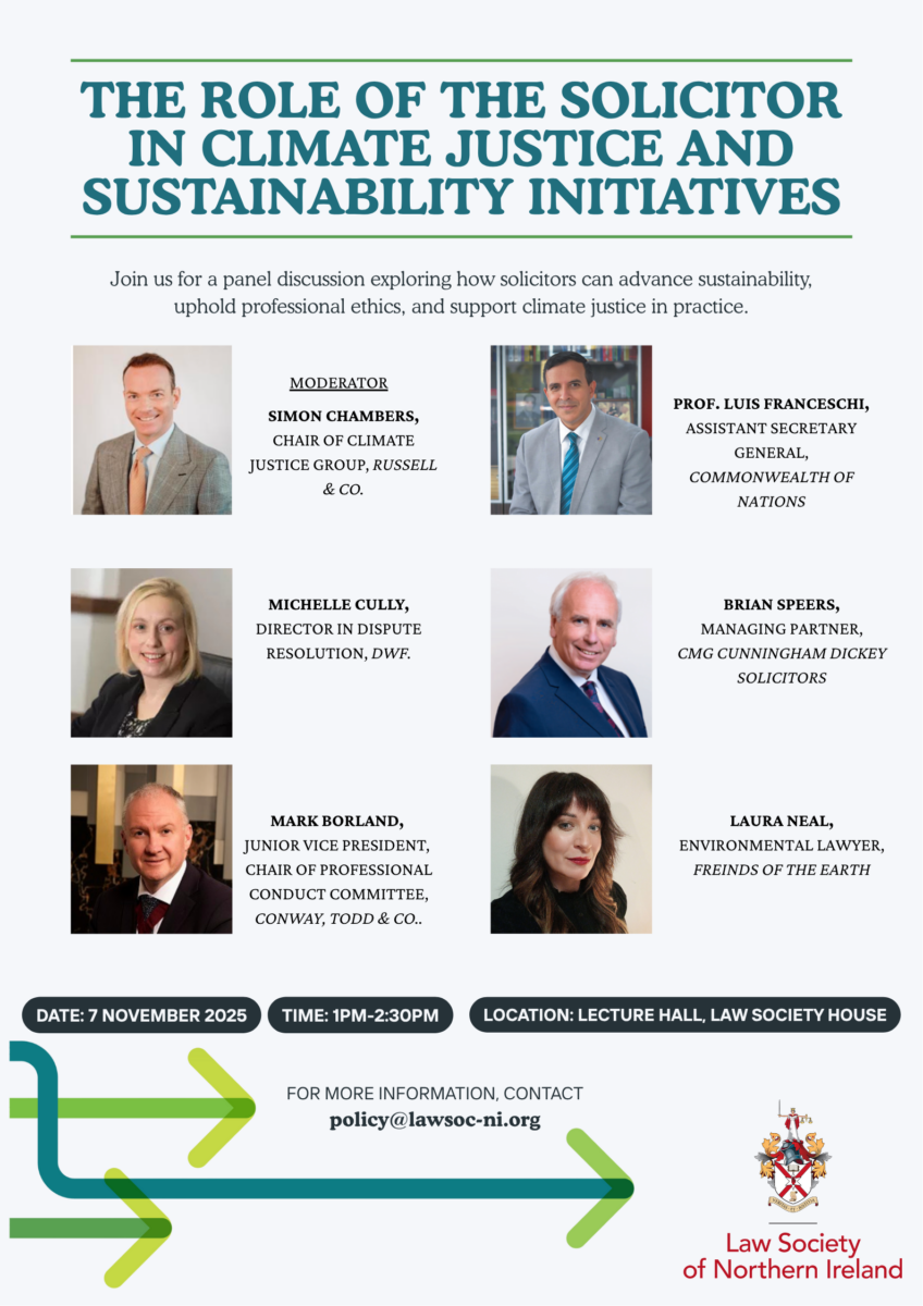The Law Society of Northern Ireland’s Climate Justice Group will host a special panel discussion exploring how solicitors can play a meaningful role in advancing sustainability and climate justice within the legal profession.